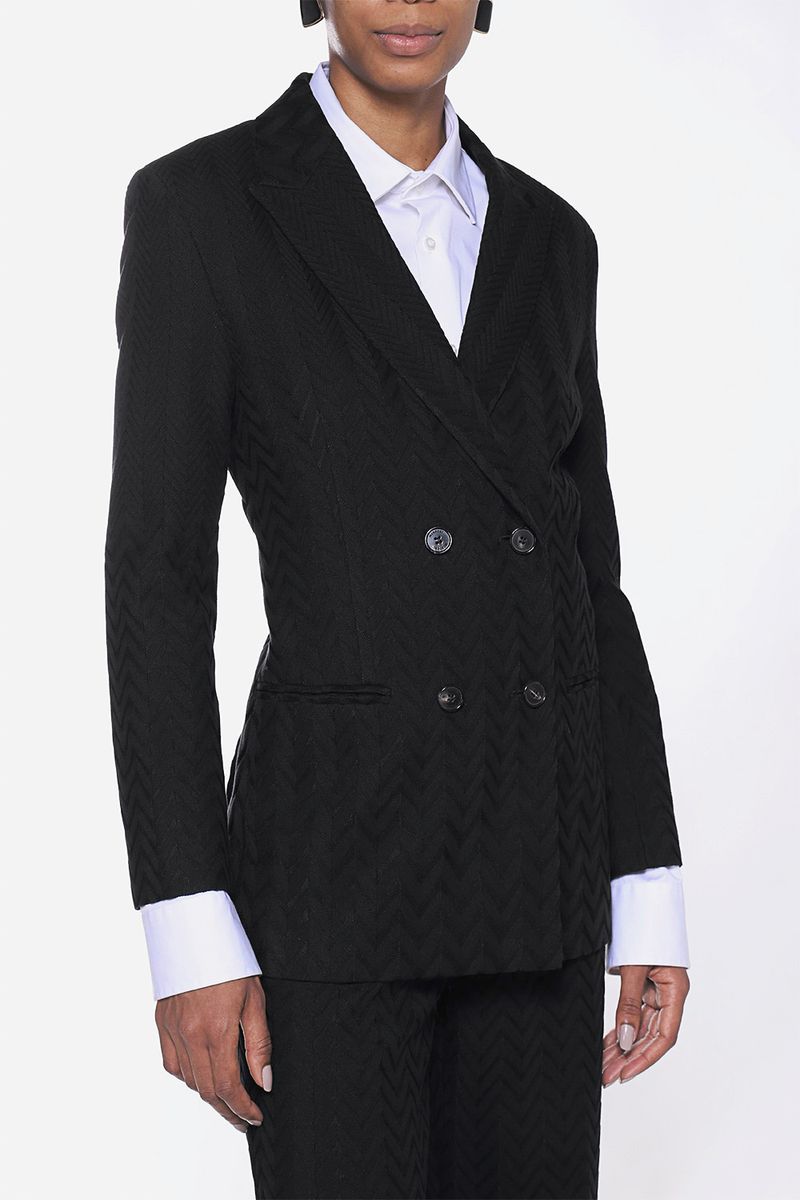 O blazer de abotoamento duplo ganha um toque moderno com o tricô raschel apresentando um degradê em ziguezague tom sobre tom. Confeccionado em uma mistura macia de algodão e viscose, o blazer tem acabamento com botões de chifre e bolsos embutidos.