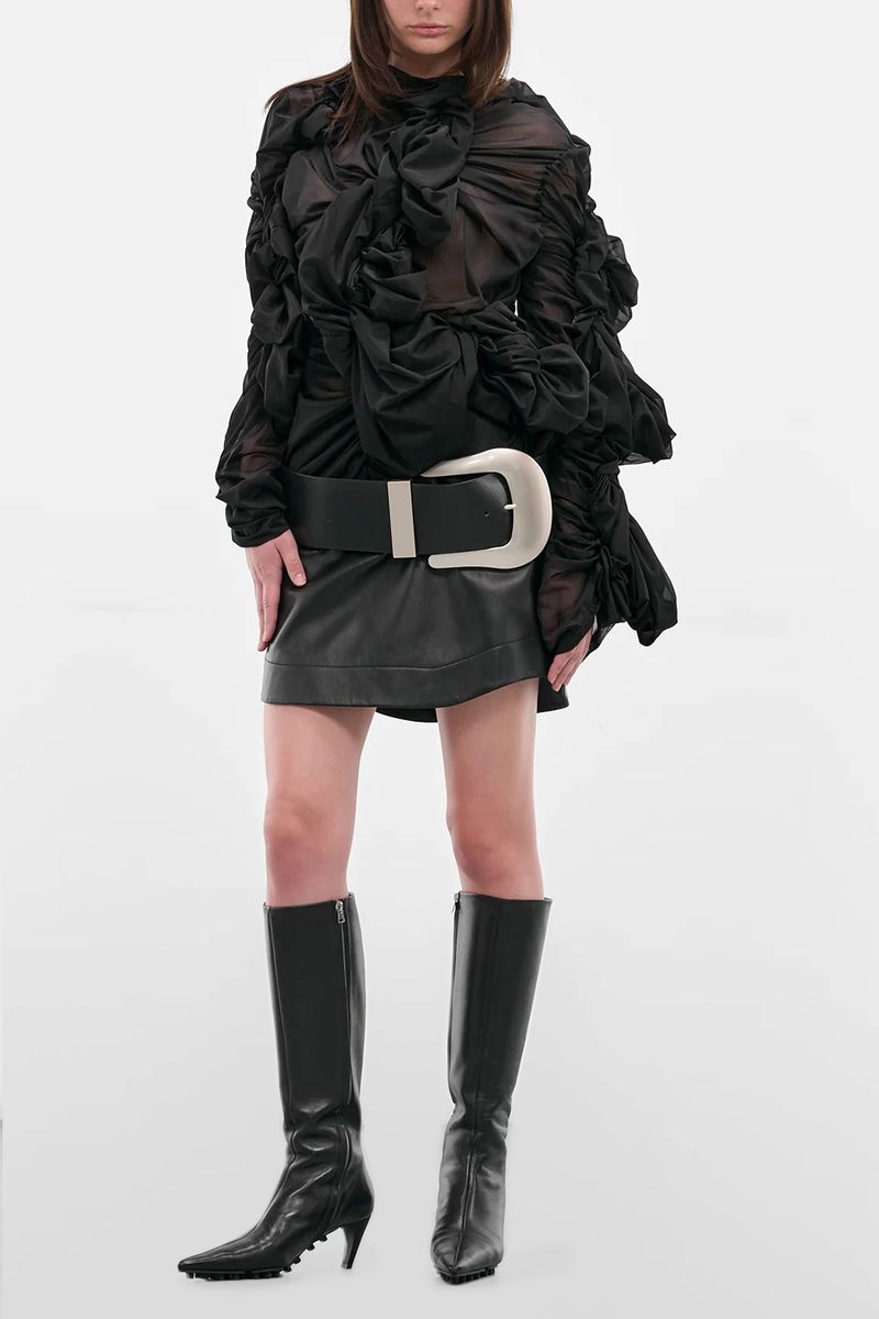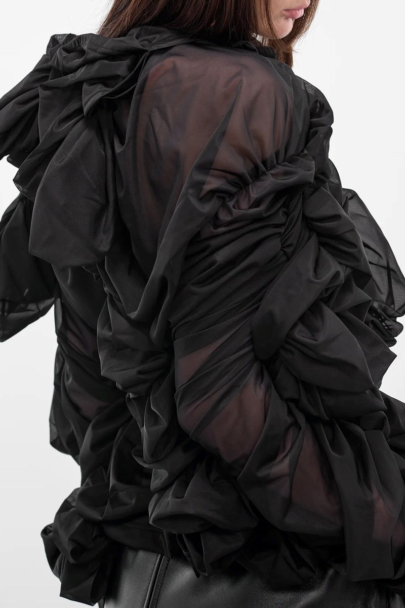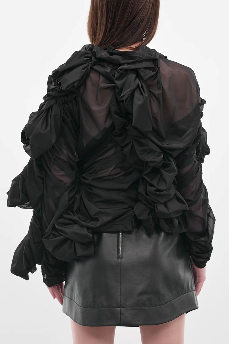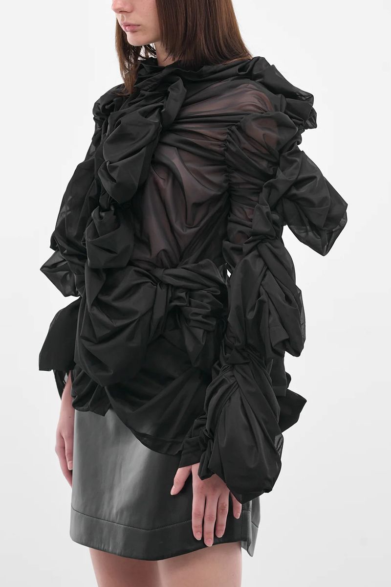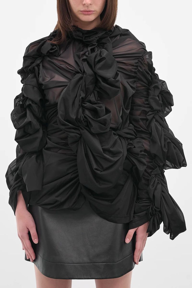 Blusa escultural preta com estrutura semitransparente. Desenhada com drapeado em camadas e franzidos torcidos por toda a peça.