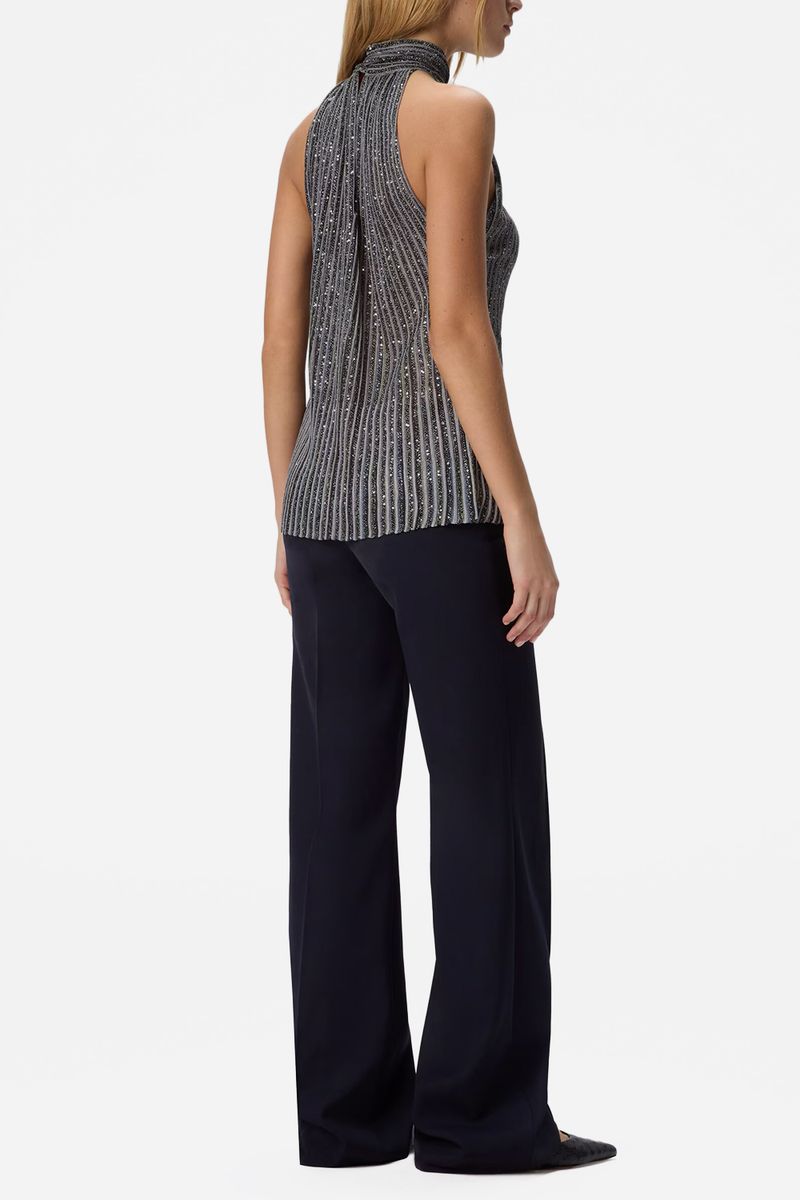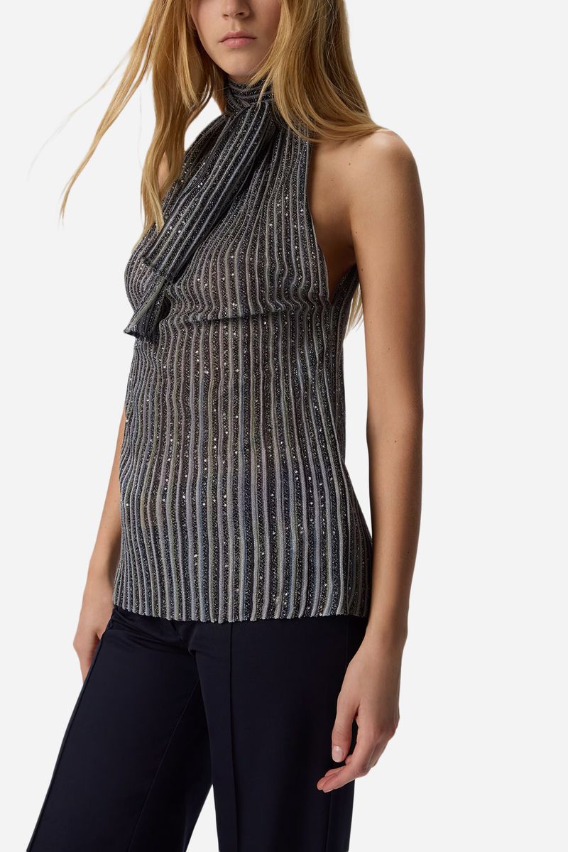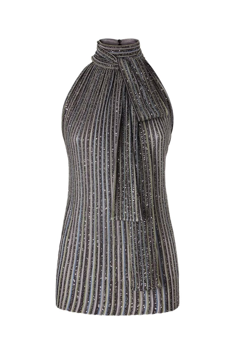 Uma homenagem à maestria da Missoni, esta blusa feminina sem mangas com laço no pescoço personifica a elegância atemporal da marca. Confeccionada em malha listrada parcialmente aberta em viscose com lantejoulas e fios de lamê, a peça brinca com texturas e luz para criar um efeito luminoso e refinado. O laço no pescoço adiciona feminilidade, enquanto a estrutura vazada da malha encontra o equilíbrio perfeito entre leveza e estrutura.