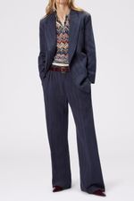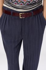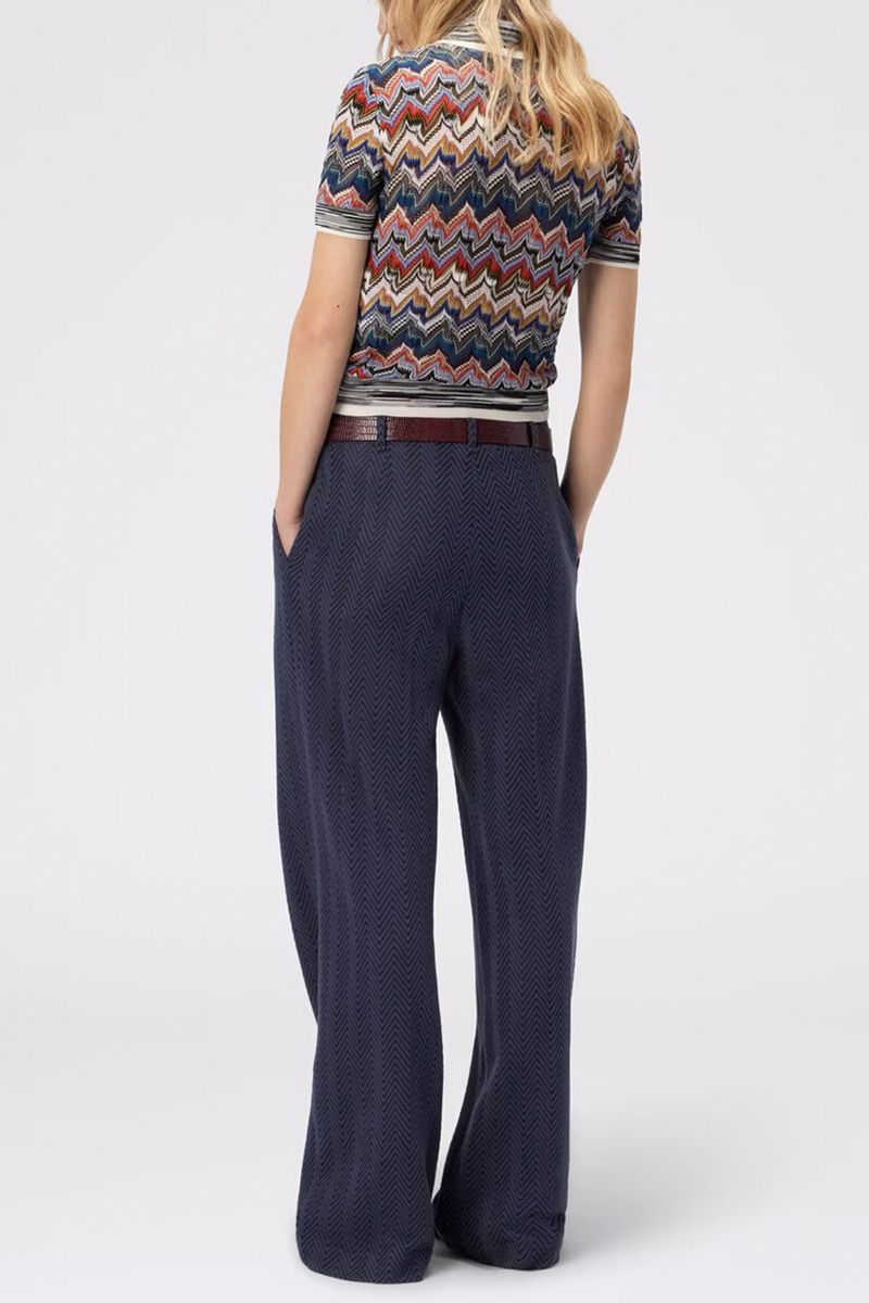 Uma calça feminina de alfaiataria que reinterpreta com elegância o icônico padrão em ziguezague da Missoni, apresentada em versão tom sobre tom com acabamento refinado em raschel. Confeccionada em tecido misto de algodão, combina estrutura e identidade gráfica em uma peça singular com um toque contemporâneo.