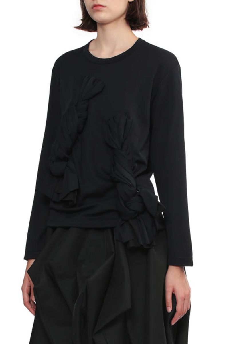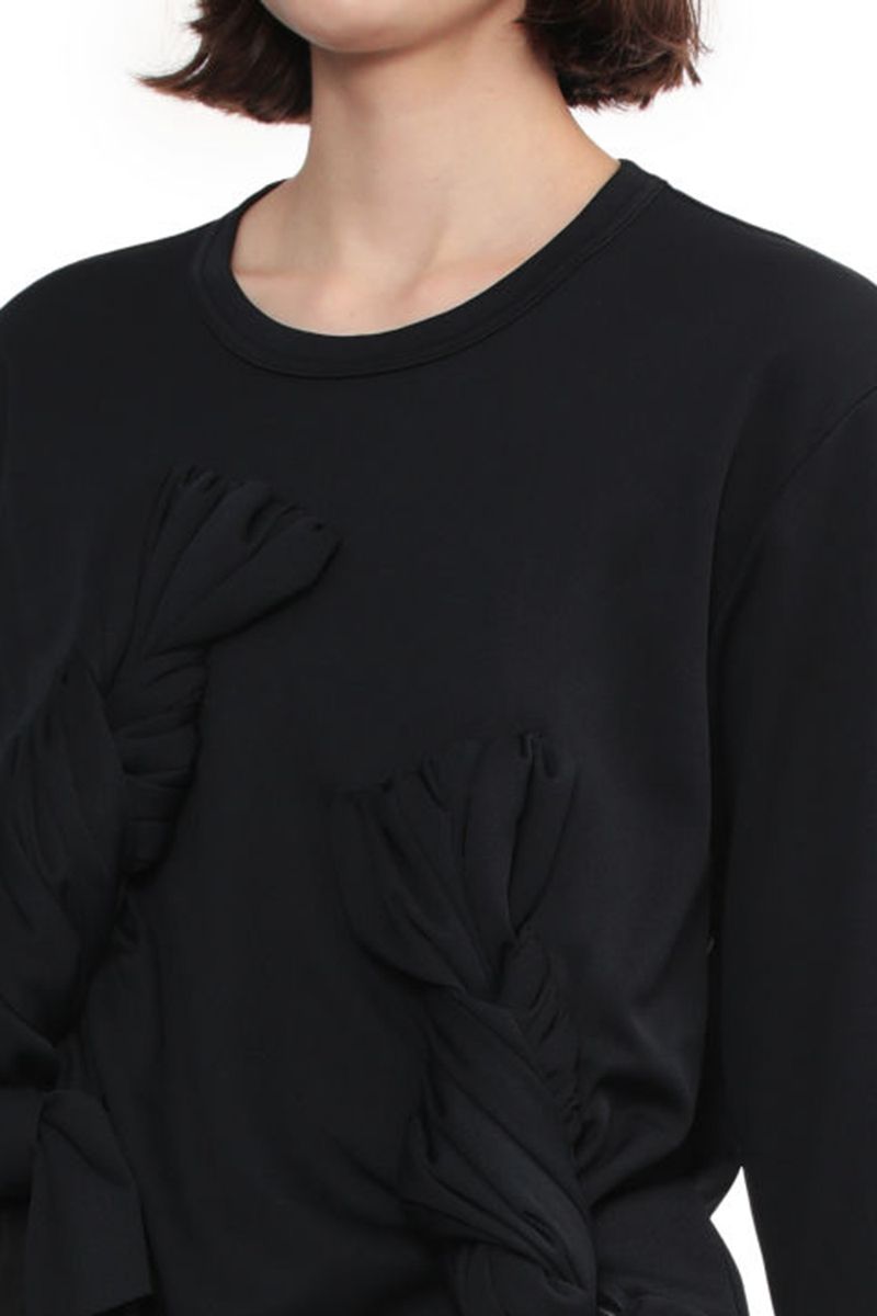Camiseta preta de algodão de manga comprida com detalhes de amarrações nas laterais. Modelagem clássica.