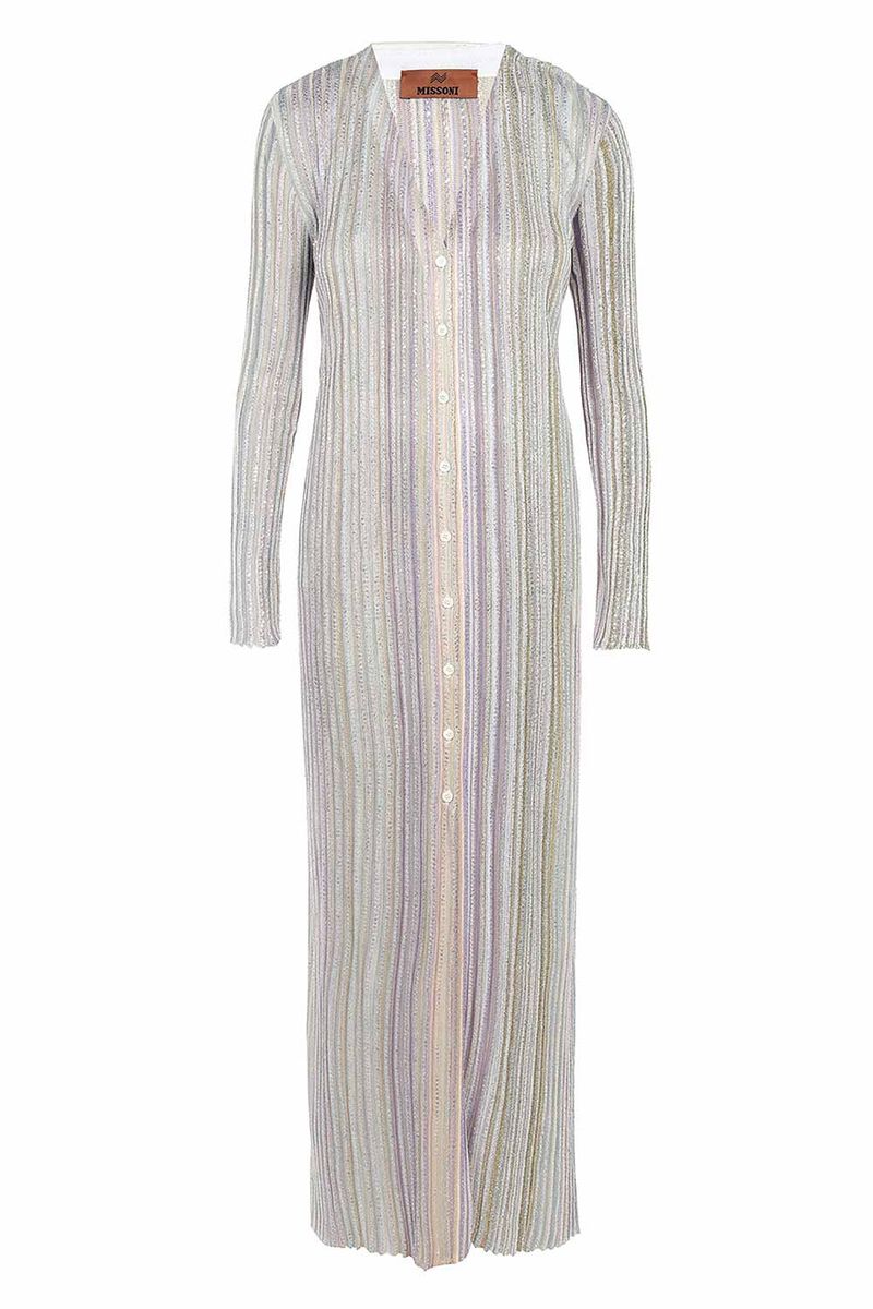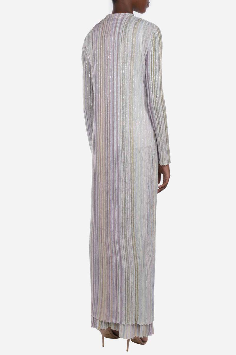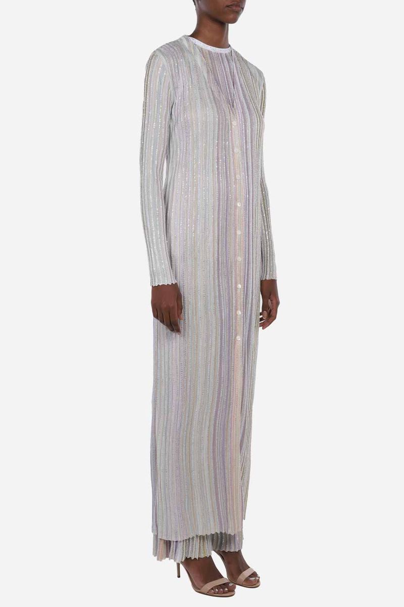 Cardigã longo feminino em viscose. A peça, que desce reta pela silhueta, é atravessada por longas listras verticais decoradas com lantejoulas. Botões personalizados e um decote em V completam o design refinado.