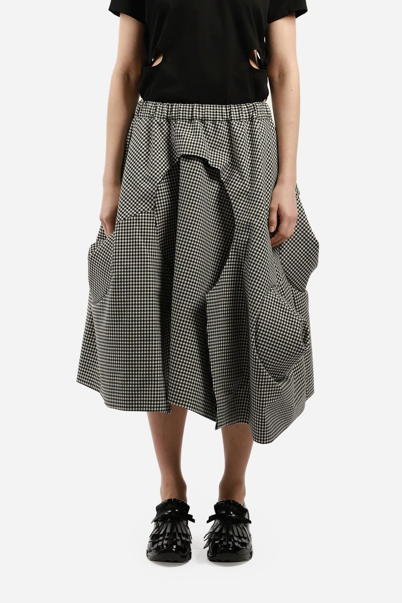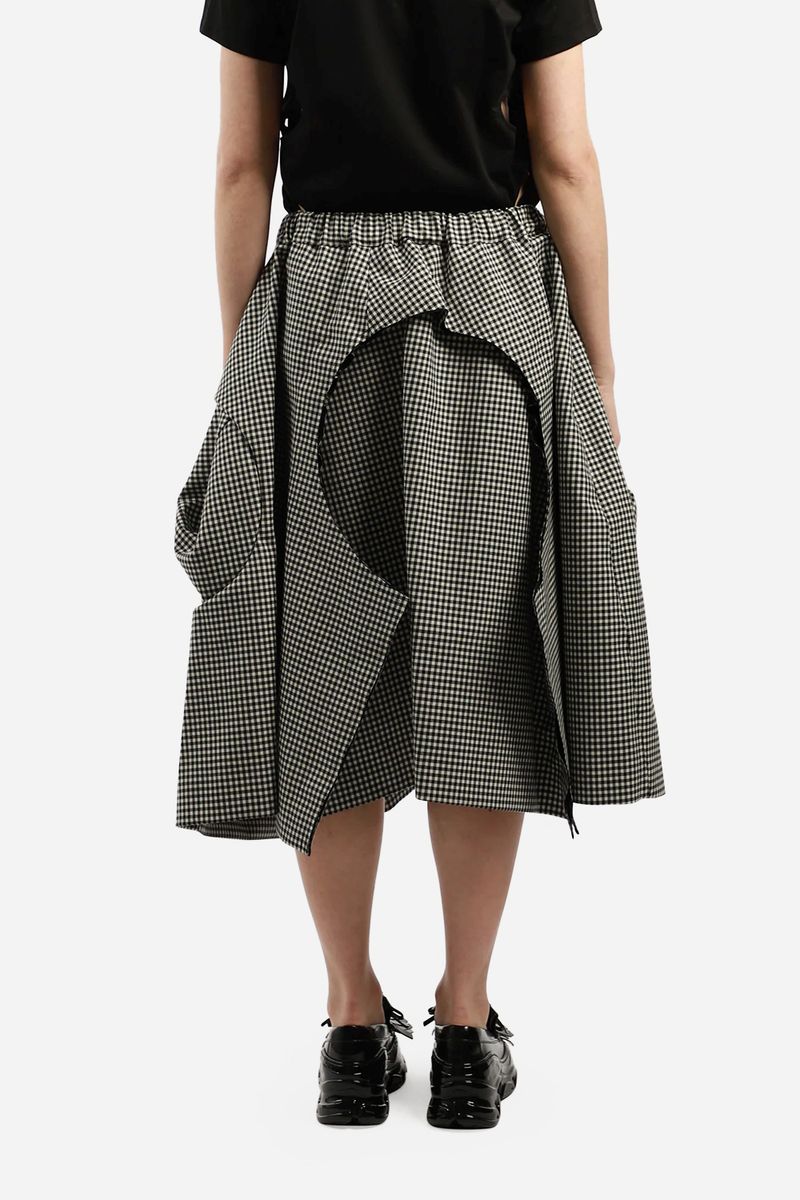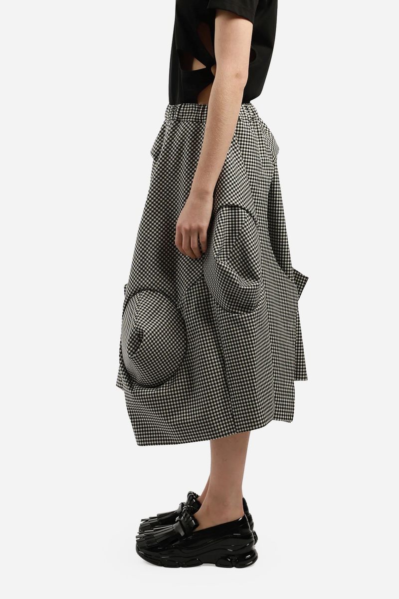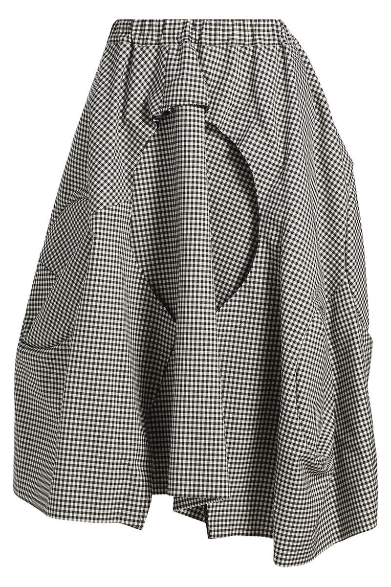 Esta saia pesada apresenta cortes assimétricos e detalhes em tecido que conferem volume à peça. Possui cós elástico, bolsos laterais e comprimento midi. Combina perfeitamente com o casaco cropped assimétrico da Comme des Garçons.