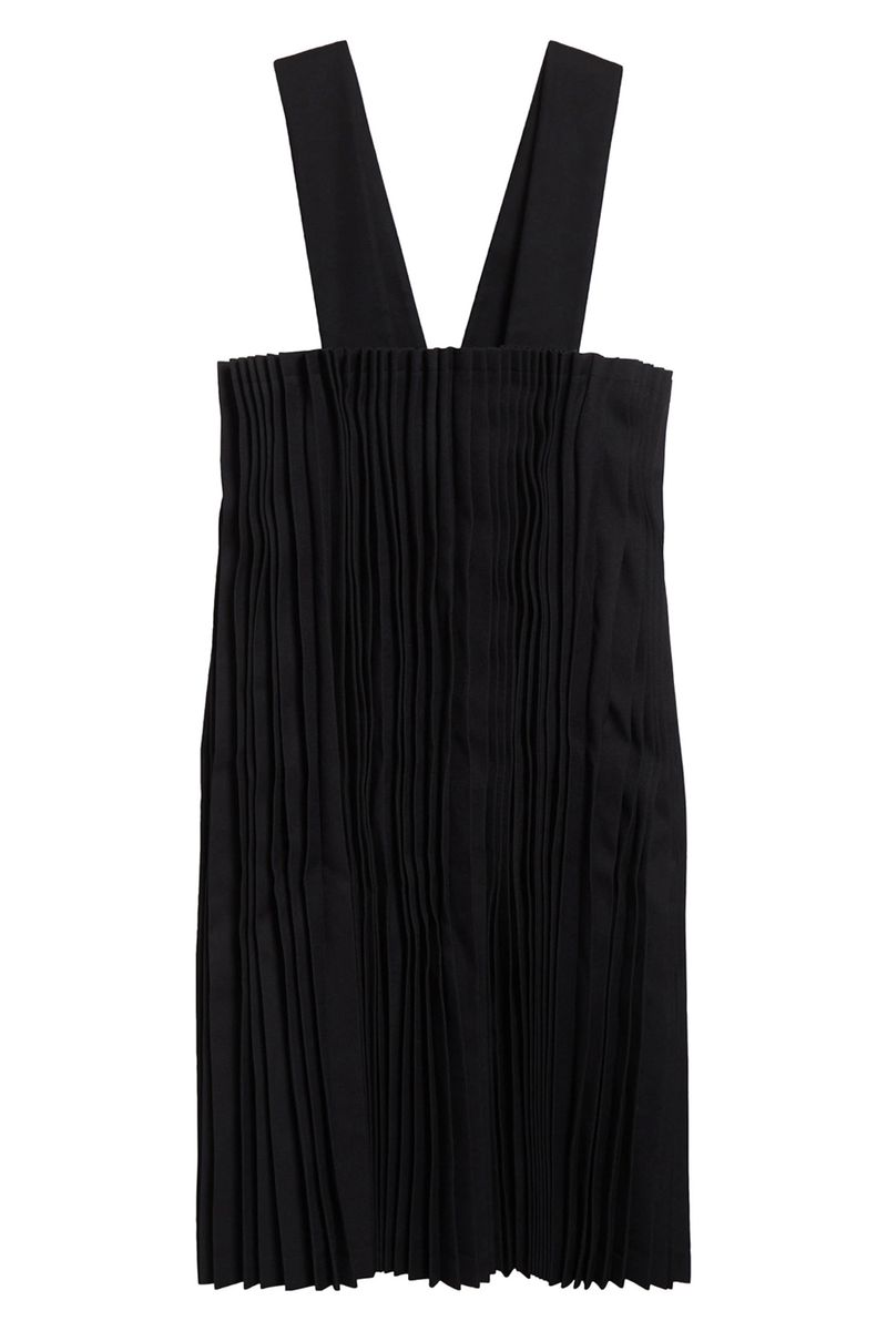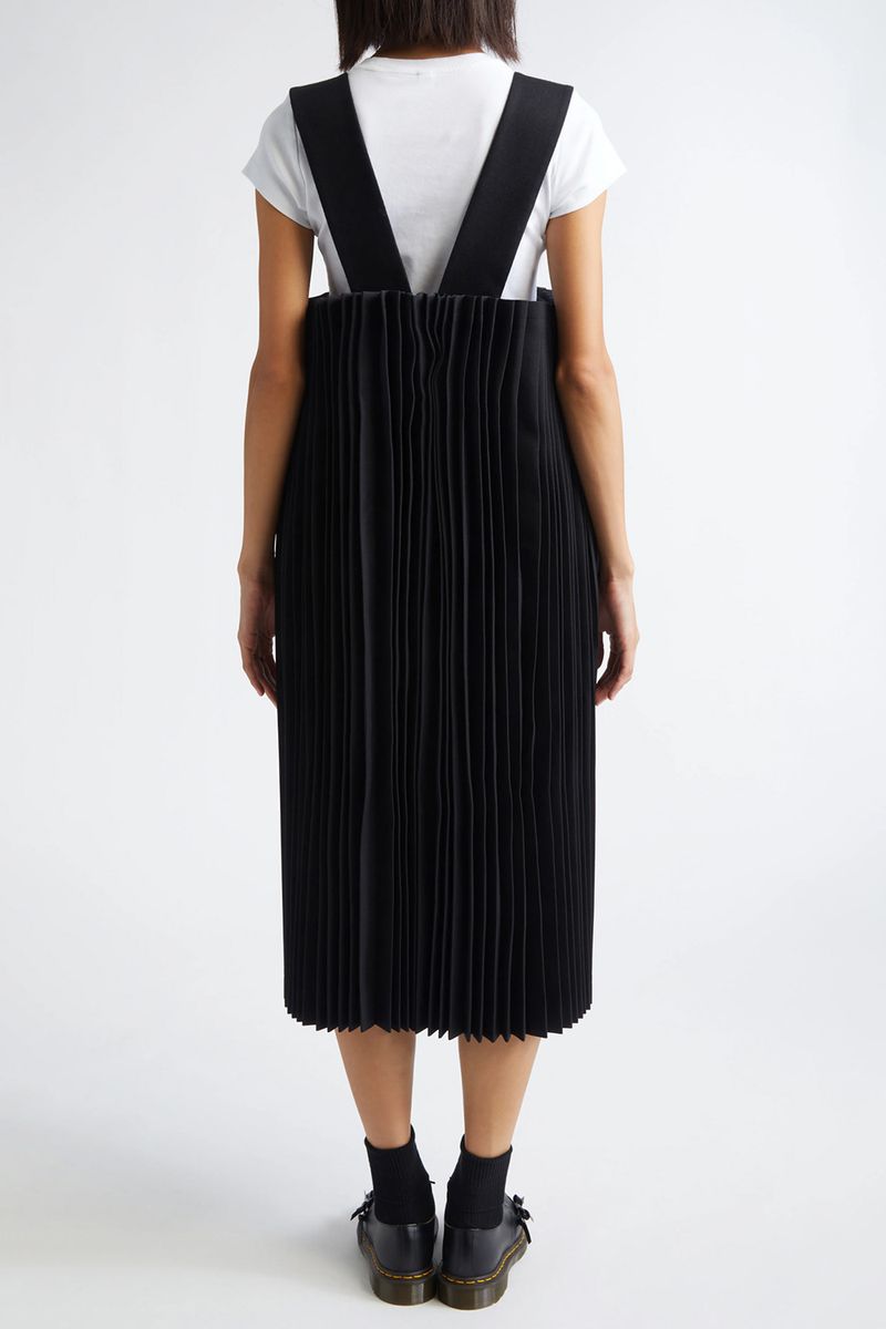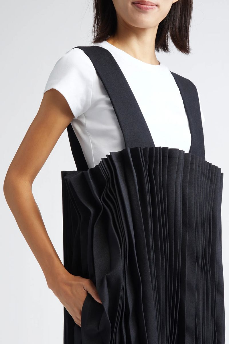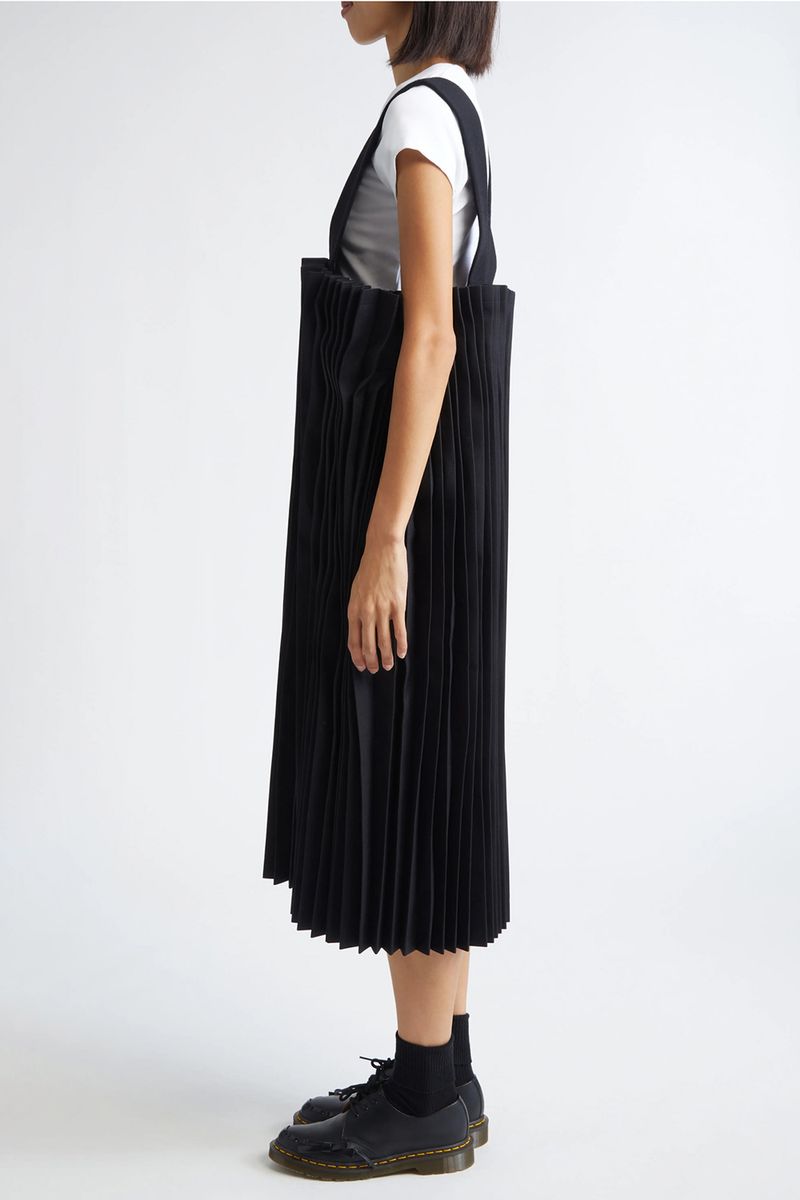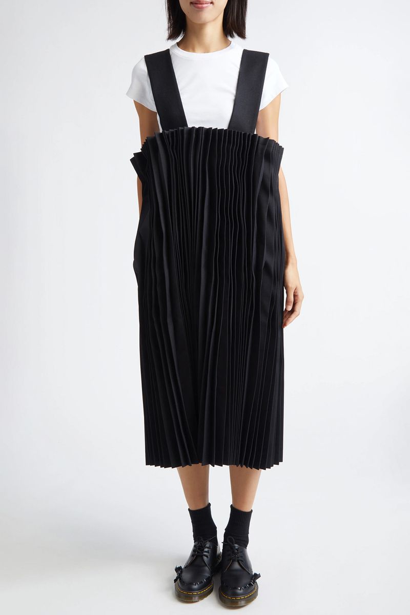Peça icônica da Comme des Garçons, esta saia preta combina design conceitual e sofisticação. Confeccionada em tecido estruturado, apresenta plissados verticais marcantes que conferem movimento e textura única. As alças largas adicionam um toque contemporâneo, permitindo composições versáteis e cheias de personalidade.