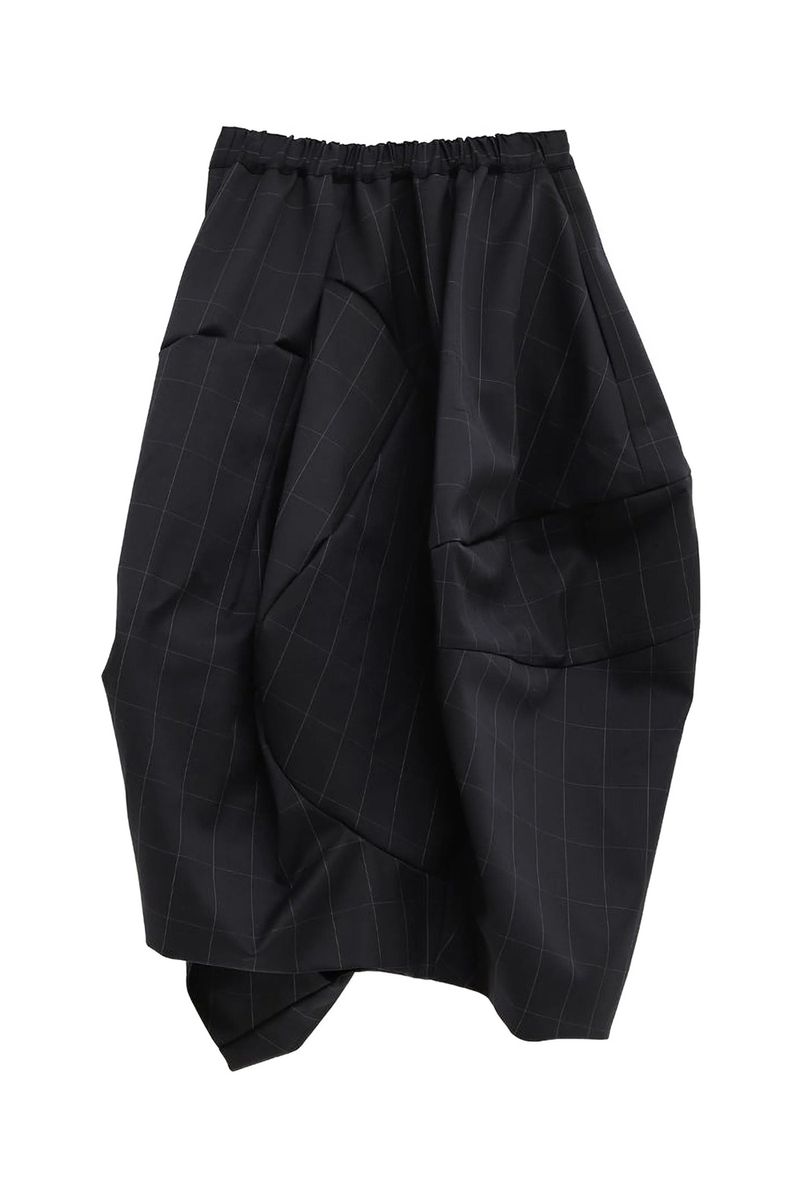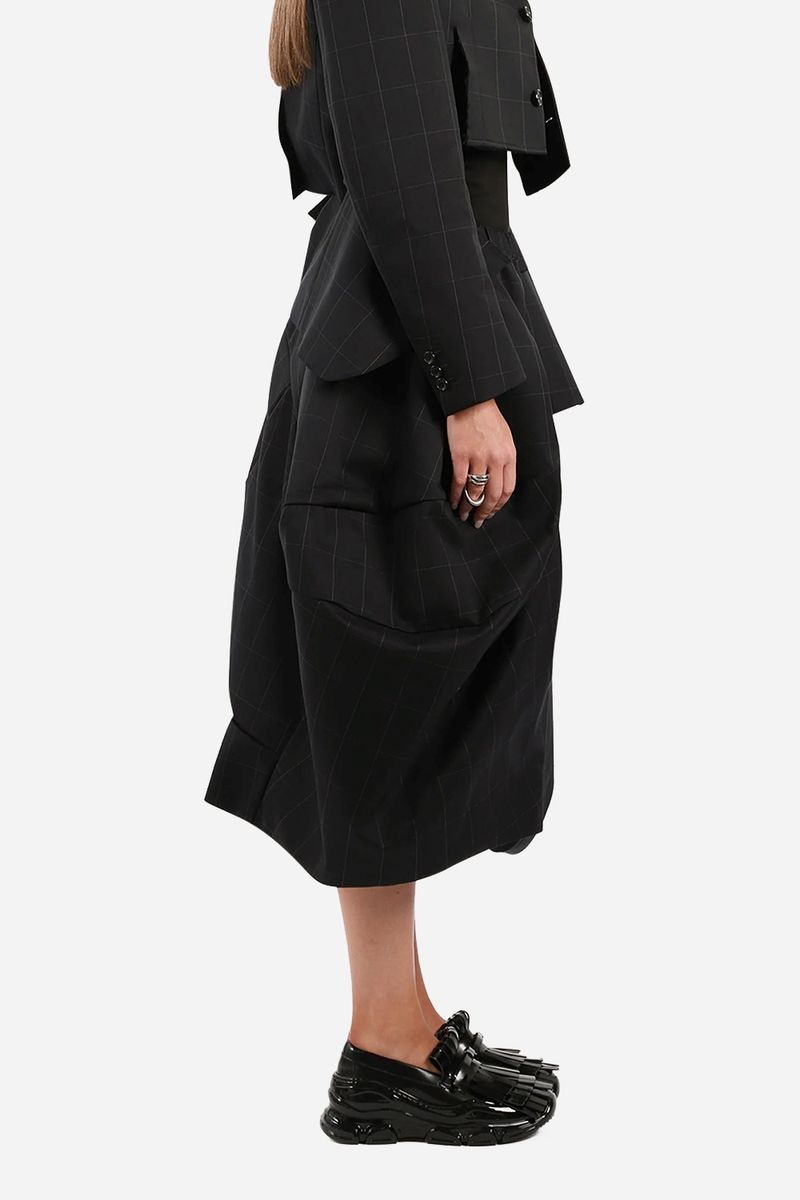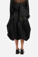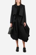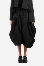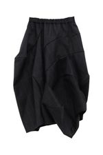 Uma saia midi com cós elástico, silhueta assimétrica com recortes nos tecidos, trazendo detalhes volumosos em 3D. Perfeita para combinar com a Jaqueta Deconstructed da Comme Des Garcons.