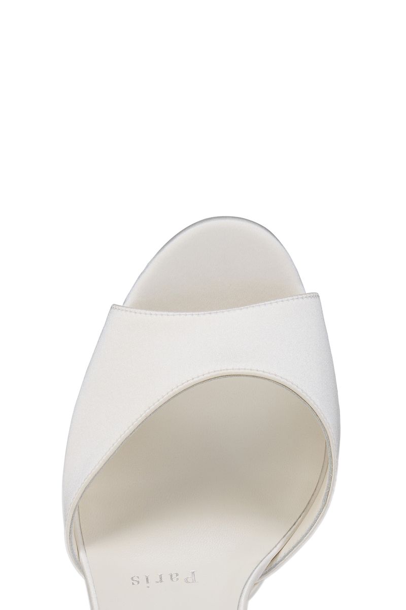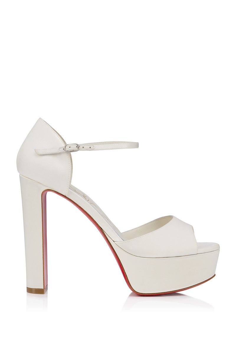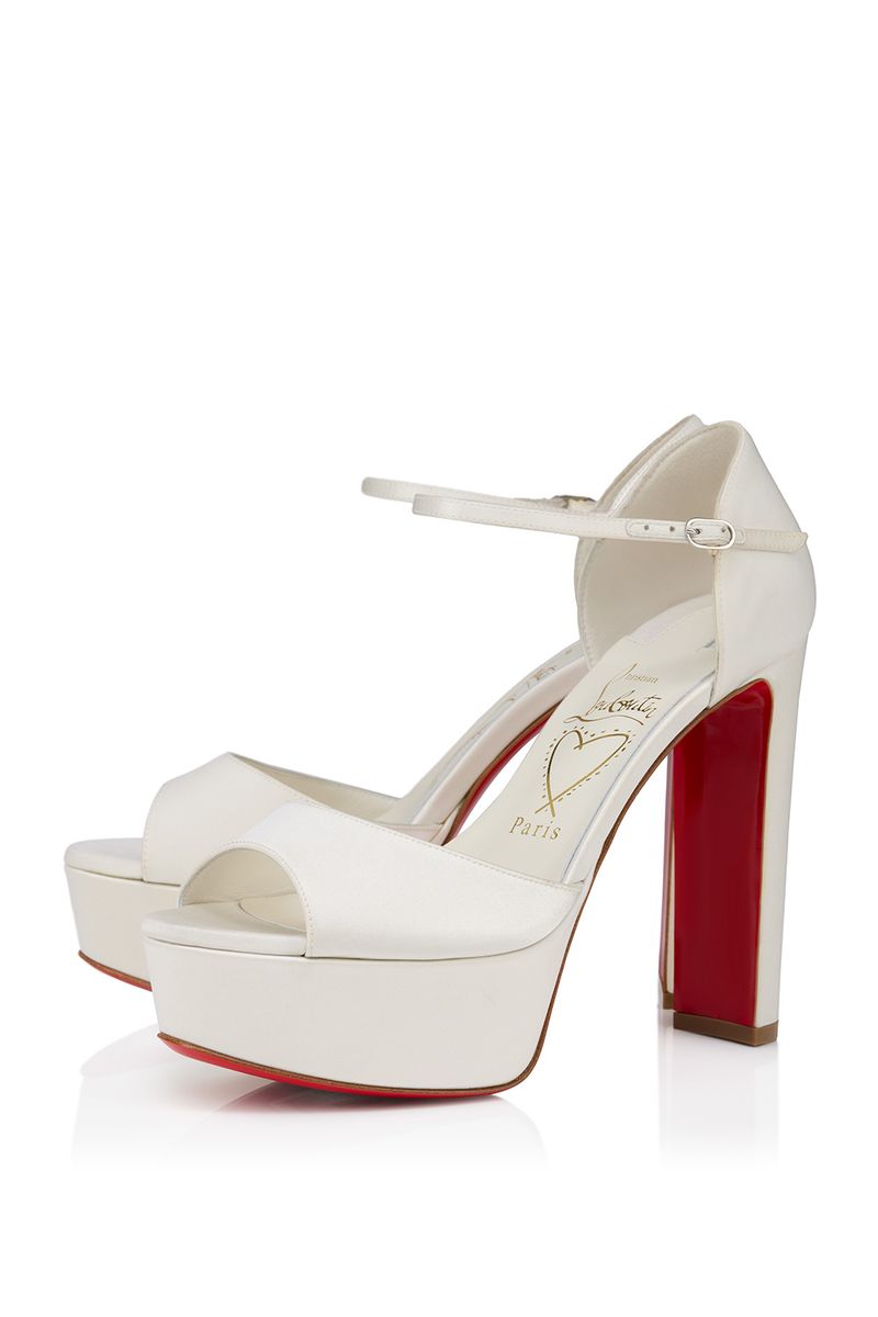 Com a ponta aberta, a Sandaloo revela o pé com elegância. Esta sandália plataforma da Maison Christian Louboutin apresenta uma tira fina no tornozelo e um salto quadrado de 130 mm. É inteiramente confeccionada em cetim crepe branco marfim. Este modelo da coleção de casamento apresenta o logotipo Christian Louboutin e o coração estampado na palmilha.