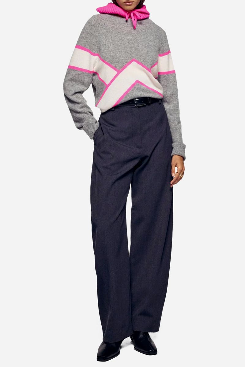 Suéter em 100% cashmere com estampa gráfica contrastante no peito e nas mangas. Seu corte oversized e gola redonda levemente solta proporcionam conforto e um toque moderno.