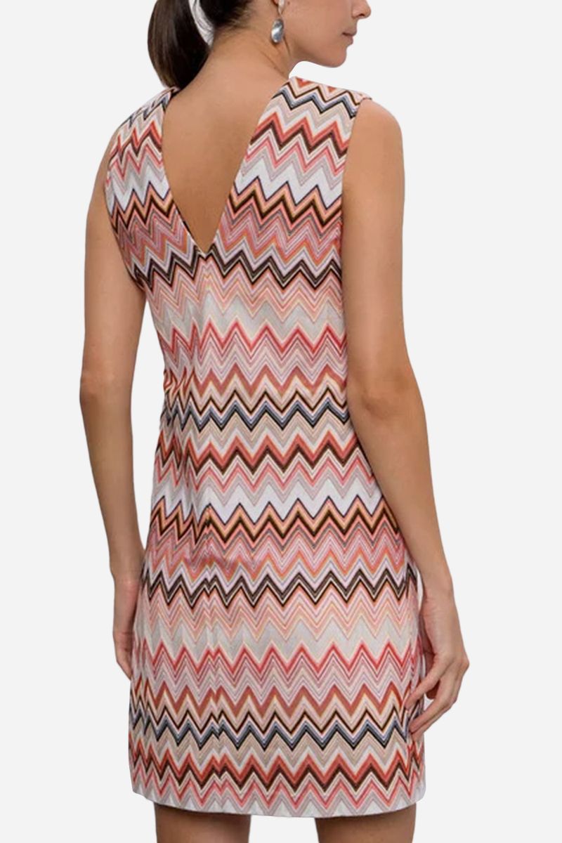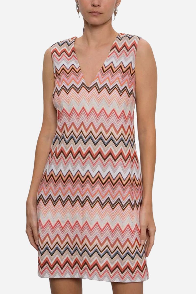 Este vestido rosa da Missoni é uma peça sofisticada e cheia de personalidade. Com design sem mangas e gola redonda, apresenta um padrão exclusivo com detalhes metálicos que adicionam brilho sutil. Confeccionado em tecido de alta qualidade, oferece caimento confortável e elegante, ideal para ocasiões especiais.